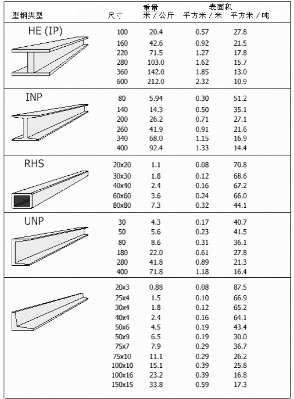 只要知道其尺寸(單位:mm),我們可以按計(jì)算出各類(lèi)型鋼的每米的面積和每噸的面積。