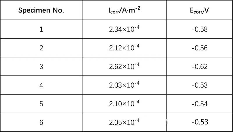 通過塔菲爾切線外延法得出6組常規(guī)涂層和石墨烯涂層的腐蝕電流(Icorr)和腐蝕電位(Ecorr),結果如表2和表3所示。從表中可以看出,常規(guī)涂層的腐蝕電流在2.05×10-4 A·m-2~2.62×10-4 A·m-2之間;而石墨烯涂層的腐蝕電流范圍為1.22×10-5 A·m-2~1.26×10-5 A·m-2,相比常規(guī)涂層,石墨烯涂層的腐蝕電流降低了一個數量級,同時其腐蝕電位也逐漸正移,表明石墨烯涂層的防腐效果較好。