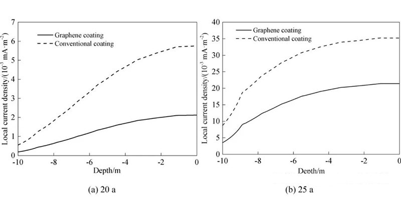 圖1示出了20 a和25 a時石墨烯涂層與常規(guī)涂層(i0=4×10-5 A/m2)作用下鋼管樁表面的局部電流密度,即腐蝕速率.在第20 a時,犧牲陽極未完全消耗殆盡,犧牲陽極作為電位較低的合金材料,使得鋼管樁成為陰極材料,其與鋼管樁之間的電位差產生一定強度的電流使得鋼管樁受到保護,鋼管樁局部電流密度處于較低水平。在第25 a時,犧牲陽極已全部消耗,鋼管樁的腐蝕速率相較于第20 a時的腐蝕速率有較大的提高,如在海平面處,對于石墨烯涂層和常規(guī)涂層而言,鋼管樁的腐蝕速率均提高了兩個數量級。此外由圖可知,泥面處的腐蝕速率較慢。使用石墨烯涂層可顯著減小鋼管樁的腐蝕速率.在20 a時,石墨烯涂層和常規(guī)涂層防護下鋼管樁在海平面處的腐蝕速率分別為2.13×10-2A/m2和5.75×10-2 A/m2,在25 a時,則分別為0.214 A/m2和0.352 A/m2,可見在20 a和25 a時,石墨烯涂層防護下的腐蝕速率為常規(guī)涂層防護下的37%和61%,這體現出了石墨烯涂層和犧牲陽極聯合防護的重要作用。