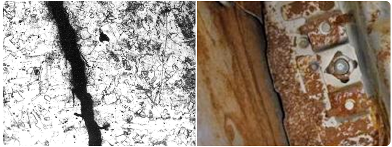 這種化學(xué)反應(yīng)使得材料中晶粒邊界處的鉻的含量減少,從而這些區(qū)域抗腐蝕的能力下降,同時(shí)這些區(qū)域還會(huì)與附近受到保護(hù)的合金形成原電池,從而高腐蝕性的環(huán)境中會(huì)產(chǎn)生焊縫腐蝕(焊接處晶粒邊界的腐蝕)。