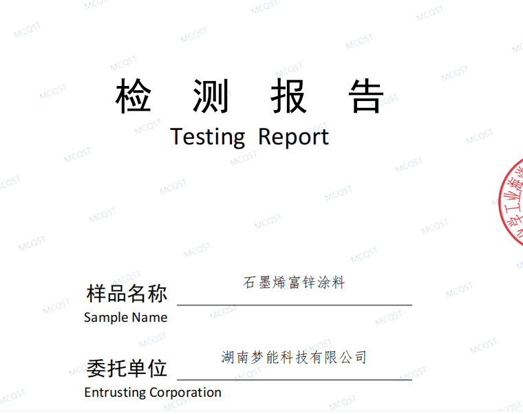 檢測結(jié)果顯示:湖南夢能科技有限公司生產(chǎn)的石墨烯富鋅涂料通過了HG/T 5573-2019 《石墨烯鋅粉涂料》Ⅱ型富鋅涂料C4~C5等級的要求測試。