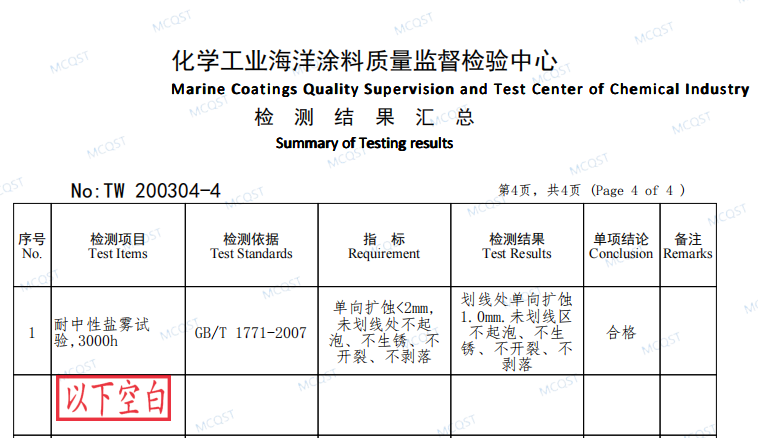 檢測結(jié)果顯示:湖南夢能科技有限公司生產(chǎn)的石墨烯富鋅涂料通過了3000h的耐中性鹽霧試驗。