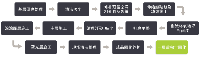 六、施工步驟基層研磨處理→清潔吸塵→修補預(yù)留空洞、粗孔洞及裂縫→伸縮縫砌縫及填縫施工→刮涂環(huán)氧地坪封閉漆→打磨平整→清理浮砂、吸塵→中層施工→滾涂面層施工→罩光層施工→現(xiàn)場清潔整理→成品固化養(yǎng)護→一周后完全固化