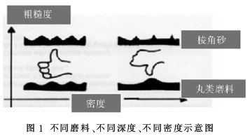 該問(wèn)題的糾正,首先應(yīng)明確粗糙度的實(shí)質(zhì)。粗糙度可從幾個(gè)方面來(lái)認(rèn)識(shí):①形狀(粗糙度微觀輪廓),取決于是棱角砂還是丸料; ②深度 (微觀波峰與波谷的距離);③密度(波峰與波谷的數(shù)量),如圖1