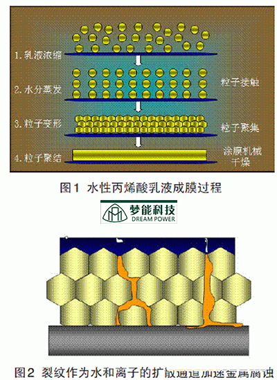 水性丙烯酸樹脂一般由乳液聚合法制備,其水性丙烯酸乳液的成膜過程主要包括4個(gè)階段(如圖1所示):(1)涂覆后水分開始蒸發(fā),乳液逐漸變得濃稠;(2)隨著乳液中水分的繼續(xù)揮發(fā),乳膠粒子逐漸靠攏并相互接觸達(dá)到密集狀態(tài);(3)當(dāng)水分蒸發(fā)到一定程度時(shí),乳膠粒子間隙變小并形成細(xì)小的毛細(xì)管,在毛細(xì)管極壓作用下發(fā)生形變并逐漸融合,直到粒子間界面消失;(4)此階段中,乳膠粒子聚結(jié)老化并達(dá)到機(jī)械干燥狀態(tài),最終乳液會(huì)在金屬表面形成一層致密的保護(hù)膜。