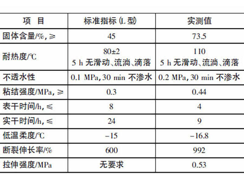 根據(jù)重質(zhì)碳酸鈣含量對(duì)涂料拉伸強(qiáng)度、斷裂伸長(zhǎng)率、低溫柔性的影響,得出重質(zhì)碳酸鈣在本體系中的臨界填料體積濃度為30%,以此為最佳添加量制備丙烯酸酯瀝青涂料,按照J(rèn)C/T 408—2005《水乳型瀝青防水涂料》標(biāo)準(zhǔn)進(jìn)行測(cè)試,涂料的綜合性能符合標(biāo)準(zhǔn)的要求,詳見(jiàn)表1。