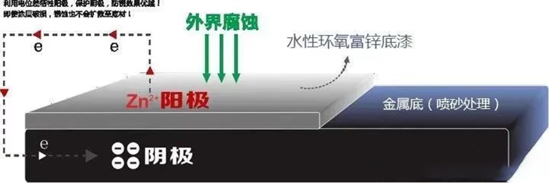 水性環(huán)氧富鋅底漆具有優(yōu)異的防腐防銹特性,鋅粉提供陰極保護(hù),電化學(xué)防腐作用。