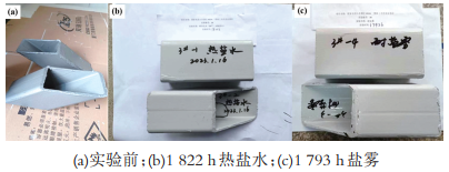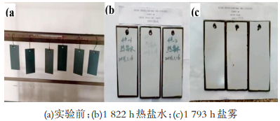 試驗(yàn)所用鍍鋅小樣為現(xiàn)場(chǎng)桁架截取,鍍鋅厚度為105μm;3#鍍鋅+涂層設(shè)計(jì)為105μm鍍鋅層、60μm鍵合型環(huán)氧連接漆、120μm鍵合型環(huán)氧中間漆、80μm高耐候脂肪族聚氨酯面漆;4#涂層設(shè)計(jì)為80μmJ專用環(huán)氧底漆、200μm鍵合型環(huán)氧中間漆、80μm高耐候脂肪族聚氨酯面漆。試驗(yàn)中,耐熱鹽水試驗(yàn)環(huán)境為60℃、3.5%氯化鈉溶液,耐鹽霧試驗(yàn)環(huán)境為鹽霧試驗(yàn)箱中標(biāo)準(zhǔn)鹽霧環(huán)境。鍍鋅+涂層方案以及涂層方案實(shí)驗(yàn)依據(jù)JTS153-2015《水運(yùn)工程結(jié)構(gòu)耐久性設(shè)計(jì)標(biāo)準(zhǔn)》設(shè)計(jì)。