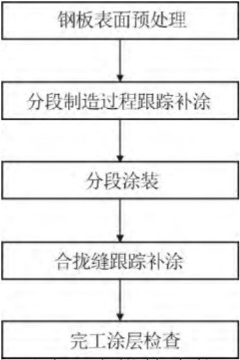 海上浮式風(fēng)電塔筒一般采用分總段制作法。首 先,由環(huán)形筒節(jié)在滾輪架上進(jìn)行組對(duì)形成筒節(jié)分段;其次,筒節(jié)分段在高負(fù)載滾輪架或?qū)S煤贤ゼ苌线M(jìn)行臥式總組; 最后,筒節(jié)總段合攏形成整個(gè)海上浮式風(fēng)電塔筒。海上浮式風(fēng)電塔筒整體涂裝工藝步驟與常規(guī)海工產(chǎn)品涂裝工藝步驟類似,一般分為五個(gè)工藝步驟,工藝流程圖如圖 1 所示。