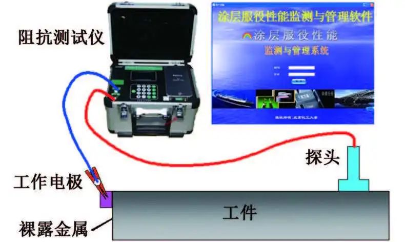對于現(xiàn)場測試,采用小范圍內(nèi)固定頻率的阻抗測試尤其是單頻測試方法更加實用。北京化工大學左禹老師課題組在對有機涂層失效過程的研究中發(fā)現(xiàn)中頻區(qū)(10 Hz左右)相位角的變化趨勢與涂層低頻阻抗(|Z|0.01Hz)的變化趨勢一致,于是提出利用中頻相位角快速評價有機涂層防護性能的方法,同時還發(fā)現(xiàn)當高頻(15 kHz)相位角降到70°時,涂層基本失去對基體的保護性能,這也可以作為評價涂層后期性能的一個重要輔助參數(shù)。中頻相位角的測試在2分鐘內(nèi)即可完成,因此該方法很適合現(xiàn)場快速檢測與評價,并在國內(nèi)外同行中得到高度認可。該團隊基于該方法建立了涂層性能檢測與壽命預測系統(tǒng),如圖1所示,并獲得專利授權(quán)。