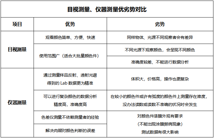 對(duì)顏色的判定一般有兩種方式,一種是目視,另一種是通過儀器測量,這兩種方法都是最為常見的測試方法,也有著不一樣的優(yōu)勢與劣勢。