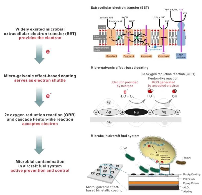 主動釋放活性氧和胞外電子傳遞聯(lián)用的“主動持續(xù)”金屬微電池抗菌涂層的構筑。西北 工業(yè)大學戚震輝課題組[53]報道了一種由雙金屬微電極體系構成的可在油水界面自催化的新型材料(WFA,圖 1)。該種材料在水介質(zhì)中通過串聯(lián)二電子氧還原反應(2e ORR)和類 芬頓反應(Fenton-like reaction)生成殺菌物質(zhì)雙氧水 H2O2和其他活性氧物質(zhì) ROS。選擇貴 金屬銀(Ag)和過渡金屬釕(Ru)構筑雙金屬(Ag-Ru)微電極體系的模型。銀離子具有 良好的殺菌活性,經(jīng)過特定處理[54]后,可以與鈀、釕、鉑等金屬形成微電池催化微區(qū)。通 過電化學實驗和 H2O2與其他 ROS 的檢測,驗證了串聯(lián)反應的存在和可行性。并在無自然光 照射下,WFA 銀-釕雙金屬顆粒微電極在 2 h 內(nèi)對飛機燃油系統(tǒng)內(nèi)常見菌(如大腸桿菌、銅 綠假單胞菌、枯草芽孢桿菌和硫酸鹽還原菌[55]等)的消毒效率均大于 99.9999%。ROS 猝滅 實驗和 Ag +電感耦合等離子體質(zhì)譜(ICP-MS)結果表明,H2O2和·O2-是其廣譜活性和高效殺 菌性能的主要作用物質(zhì)。同時,WFA 雙金屬微電極體系可以在飛機燃油系統(tǒng)無光黑暗條件 下進行高效殺菌?;诮饘匐x子的特性,雙金屬體系可以很容易地通過電化學沉積的方法涂 覆在不同形狀的金屬表面,如不銹鋼。同時,燃油微生物與微電池涂層表面接觸時有明顯的 電流產(chǎn)生;當使用死的菌與涂層作用時,電流強度明顯減弱、ROS 釋放現(xiàn)象基本消失。因 此,微生物胞外電子傳遞是揭示燃油系統(tǒng)微生物在微電池涂層表面主動殺除機制的關鍵突破 口。該雙金屬微電極殺菌體系利用水作為介質(zhì),同時適用于燃油體系黑暗條件,可為高效非 化學自催化殺菌材料的開發(fā)提供新的思路。