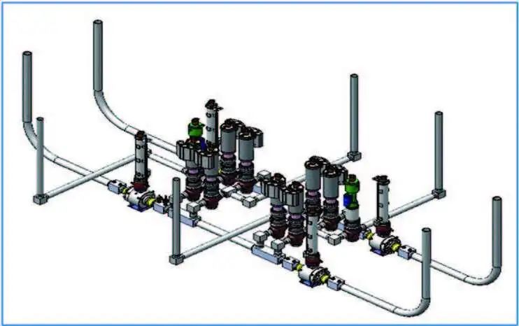 雙相不銹鋼中鐵素體與奧氏體各約占50%,較少相含量最少達到30%。雙相不銹鋼兼具奧氏體不銹鋼和鐵素體不銹鋼的優(yōu)點:與鐵素體不銹鋼相比,雙相不銹鋼塑性、韌性更高,室溫脆性、耐晶間腐蝕性能和焊接性能明顯提高;與奧氏體不銹鋼相比,雙相不銹鋼強度高且耐晶間腐蝕、耐氯化物應力腐蝕性能提高。水下生產(chǎn)設施需具有較長的服役壽命和極高的可靠性,因為它一旦失效可能造成嚴重的后果且維護費用高昂。雙相不銹鋼在耐點蝕、耐縫隙腐蝕、耐應力腐蝕方面性能優(yōu)異,廣泛應用于中心管匯主工藝管線、小口徑儀表管、閥門等。流花某氣田中心管匯的主工藝管線、管件使用材料為S31803雙相不銹鋼,管線三維圖如圖2所示,該中心管匯經(jīng)過了防腐蝕涂裝。