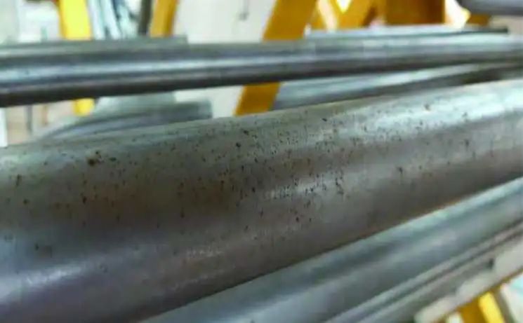 陰極保護電流對不銹鋼鈍化膜的影響較為復雜,極化電位不同可能會導致表面鈍化膜變化。鈍化膜在雙相不銹鋼管線整體防腐蝕體系中仍然發(fā)揮著重要的防護作用,特別是對于欠保護或電流屏蔽處管線。游離鐵會導致雙相不銹鋼表面污染從而影響鈍化膜的形成,如圖5所示。雙相不銹鋼管線的表面處理和噴涂應在獨立的車間或?qū)S脠龅剡M行,噴砂和作業(yè)環(huán)境均需與碳鋼作隔離處理。
