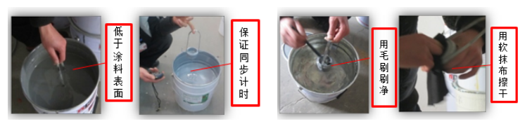 b. 將試樣攪拌均勻。左手持秒表,按下秒表上切換按鈕,切換至計時模式;右手持涂-4杯,將其完全浸沒在油漆中,保證黏度杯上平面略低于涂料表面。