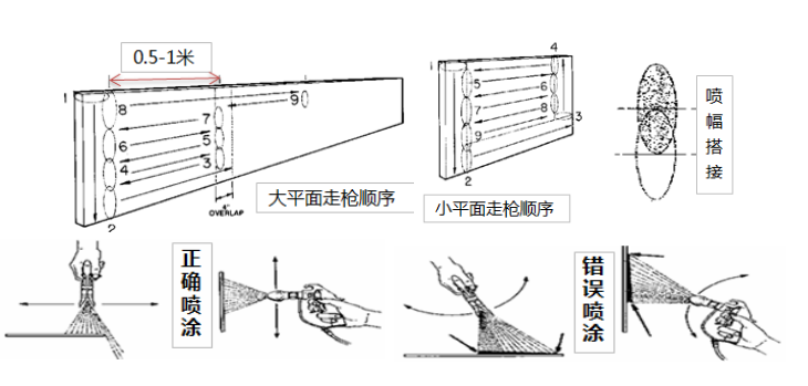 噴槍垂直于噴涂表面;距噴涂表面20-30cm;噴涂速度30-60cm/s;噴幅搭接1/2—1/3,如下圖所示。零部件涂裝漆膜厚度要求90-130um。