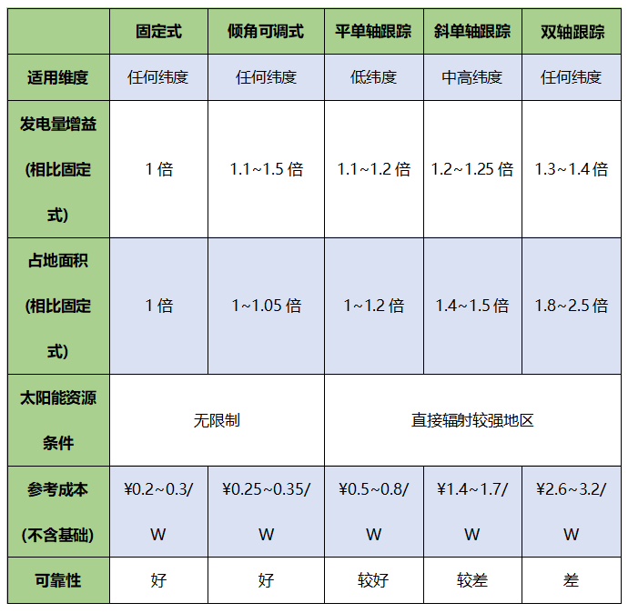 光伏支架成本雖然在整個(gè)光伏發(fā)電系統(tǒng)總成本中占比不大,只有百分之幾,但選型確很重要,主要考慮因素之一就是耐候性。光伏支架在25年的壽命周期內(nèi)必須保證結(jié)構(gòu)牢固可靠,能承受環(huán)境侵蝕和風(fēng)、雪載荷。還要考慮安裝的安全可靠,能以最小的安裝成本達(dá)到最優(yōu)的使用效果。另外,后期是否能夠免維護(hù),有沒(méi)有可靠的維修保證以及支架壽命周期結(jié)束以后是否可回收等都是需要考慮的重要因素。在設(shè)計(jì)和建設(shè)光伏電站時(shí),選擇固定式支架、傾角可調(diào)式支架還是自動(dòng)跟蹤式支架,需要因地制宜綜合考慮,因?yàn)楦鞣N方式畢竟各有利弊,都在探索和完善之中,不同類(lèi)型光伏支架特點(diǎn)如下圖所示: