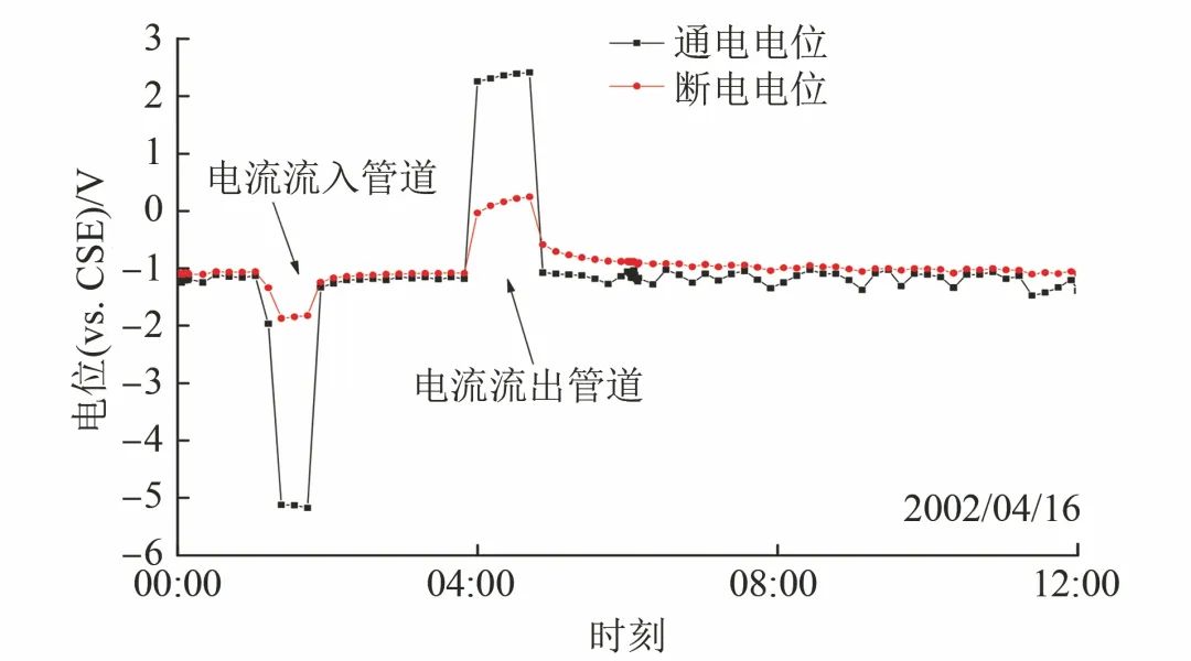 高壓直流接地極干擾時,一般通過監(jiān)測管道的通電電位、斷電電位,根據(jù)電位大小及變化情況判斷干擾的影響范圍以及是否有人身安全風(fēng)險。