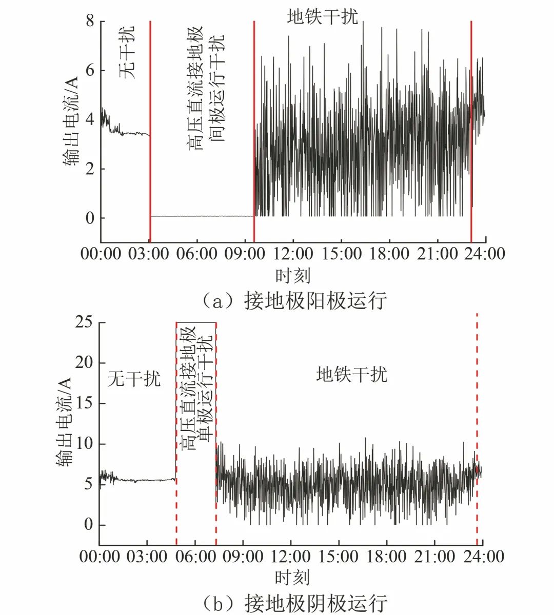 正常情況下,恒電位儀以恒電位模式運行,若受到較強的動態(tài)直流雜散電流干擾,則以恒電流模式運行,當(dāng)同時受到高壓直流接地極干擾與地鐵雜散電流干擾時,恒電位儀的自動調(diào)節(jié)功能將無法滿足抑制雜散電流干擾的需求。對于同時受到動態(tài)直流干擾和高壓直流接地極干擾的管段,一般安裝具備快速調(diào)節(jié)功能的新型智能抗干擾恒電位儀。當(dāng)高壓直流接地極單極大地回路運行時,大量電流流入管道,使管道電位負(fù)于設(shè)定值,恒電位儀就會減少輸出甚至輸出為0,當(dāng)電流流出管道,管道電位正向偏移,恒電位儀輸出顯著增加。從恒電位儀的輸出變化情況可以間接監(jiān)測高壓直流接地極的單極運行情況。