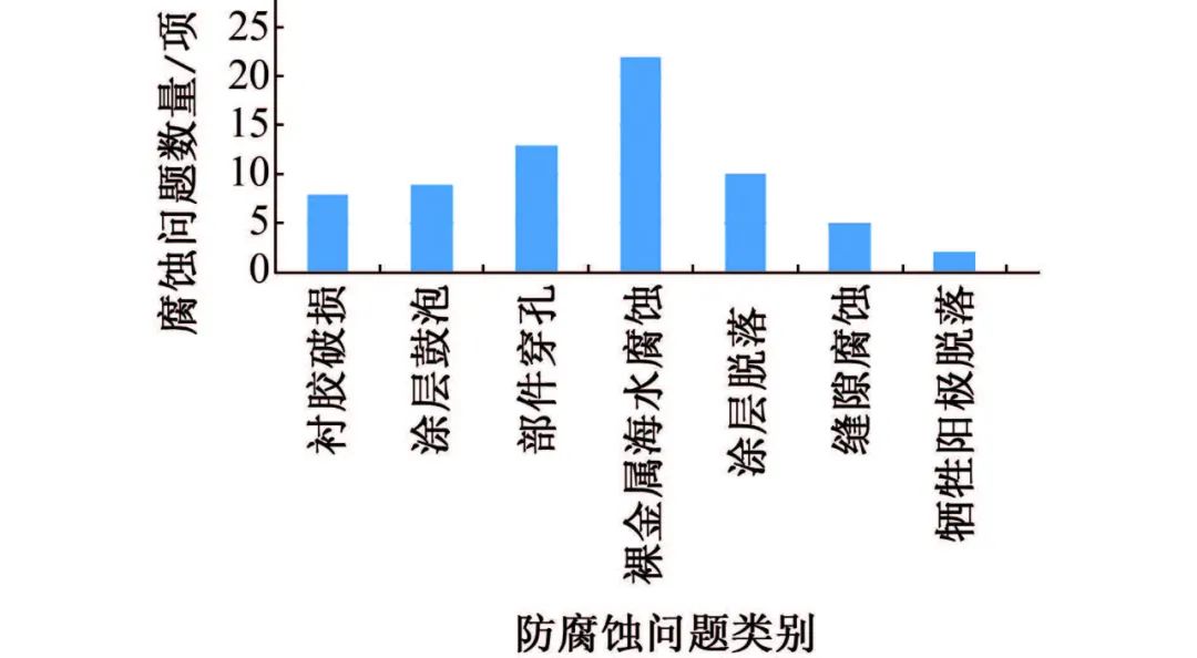根據(jù)已建立的設(shè)備預(yù)防性防腐蝕管理體系,在防腐蝕大綱系統(tǒng)分大綱的編制過程中,應(yīng)了解現(xiàn)場(chǎng)設(shè)備及其腐蝕狀況,通過防腐蝕措施更替或修復(fù)措施使設(shè)備防腐蝕措施的整體性能參數(shù)不降低或至少達(dá)到原同等水平,不至于影響其預(yù)期功能甚至影響整個(gè)設(shè)備和系統(tǒng)的預(yù)期功能。在制定針對(duì)單個(gè)具體設(shè)備的預(yù)防性防腐蝕實(shí)施項(xiàng)目時(shí),應(yīng)根據(jù)設(shè)備防腐蝕措施使用或操作說明書確定防腐蝕措施的固有壽命周期。根據(jù)設(shè)備重要性確定在其固有壽命周期內(nèi)設(shè)備預(yù)防性防腐蝕檢查或修復(fù)的次數(shù),重視設(shè)備防腐蝕狀態(tài)變化的根本原因分析,審慎確定當(dāng)前防腐蝕狀態(tài)影響防腐蝕項(xiàng)目實(shí)施周期的定量化判據(jù)。某核電機(jī)組某次大修共計(jì)完成的71項(xiàng)防腐蝕檢查,主要包括襯膠破損、襯膠鼓泡、部件穿孔、裸金屬海水腐蝕、涂層脫落、縫隙腐蝕、犧牲陽極脫落等,防腐蝕問題類別對(duì)應(yīng)的腐蝕問題事件數(shù)量如圖2所示??梢钥闯觯憬饘俸Kg在所有腐蝕問題事件中占比最大,這些腐蝕問題可能與管道選材、防腐蝕措施選用不當(dāng)有較大關(guān)系,而襯膠破損、涂層脫落等更多與襯膠、涂裝工藝與表面預(yù)處理有關(guān),這些問題應(yīng)在防腐處理實(shí)施工藝控制(含人員資質(zhì)及施工質(zhì)量過程控制)規(guī)程中予以更多關(guān)注。