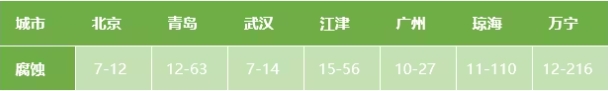 由上表可見,海洋大氣環(huán)境的腐蝕遠(yuǎn)大于內(nèi)陸環(huán)境,南方潮濕環(huán)境大于北方干燥環(huán)境。試驗驗證了大氣腐蝕破壞的本質(zhì)和速率是由表面薄電解質(zhì)液膜成分和性質(zhì)決定的,普遍認(rèn)為大氣腐蝕的因素中濕度(濕潤時間)、SO2和氯化物污染水平最為關(guān)鍵。