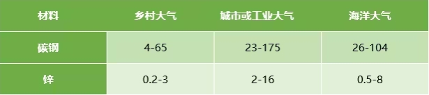 碳鋼、鋅的大氣腐蝕速率比較: 單位:μm/a