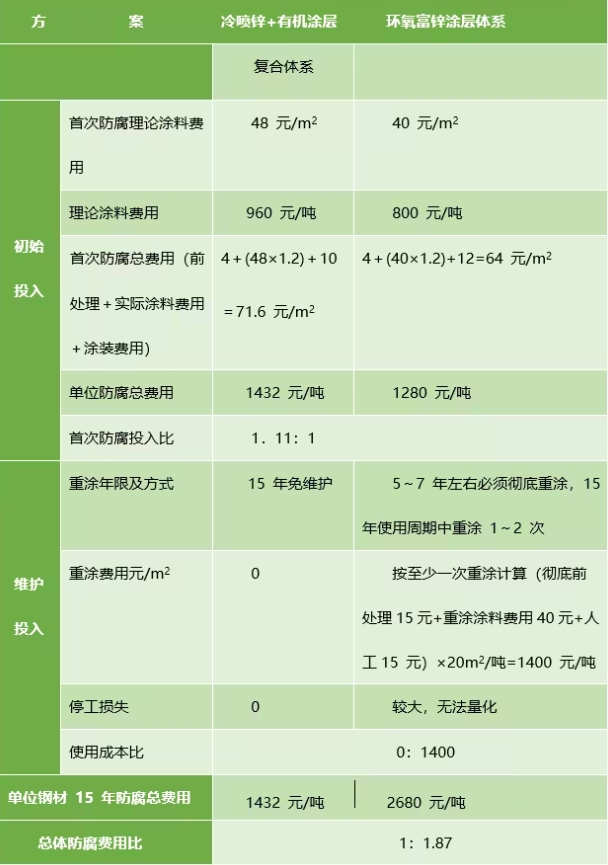 一般按照電廠所處地區(qū)的環(huán)境條件的不同按以上順序選擇合理的涂裝材料。筆者認(rèn)為內(nèi)陸地區(qū)可選用環(huán)氧富鋅底漆配套環(huán)氧云鐵中間漆和氯化橡膠面漆;在沿海地區(qū)由于環(huán)境濕度大,空氣中含鹽粒子量大,一般采用環(huán)氧富鋅類油漆 3-7 年就需要維護(hù)性涂裝,且可維護(hù)性較差,可采用全壽命周期內(nèi)經(jīng)濟(jì)性較好的冷噴鋅復(fù)合涂層方案。3.2 沿海大氣環(huán)境火力發(fā)電廠露天鋼結(jié)構(gòu)兩種腐蝕防護(hù)涂裝方案的經(jīng)濟(jì)比較