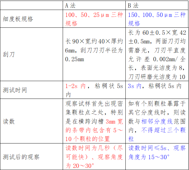 4.4測試時刮刀應盡量垂直,刮刀向后傾斜所得細度值偏?。殻?,向前傾斜所得細度偏大(粗)。測試時雙手用刀要均勻,不偏重一邊;
