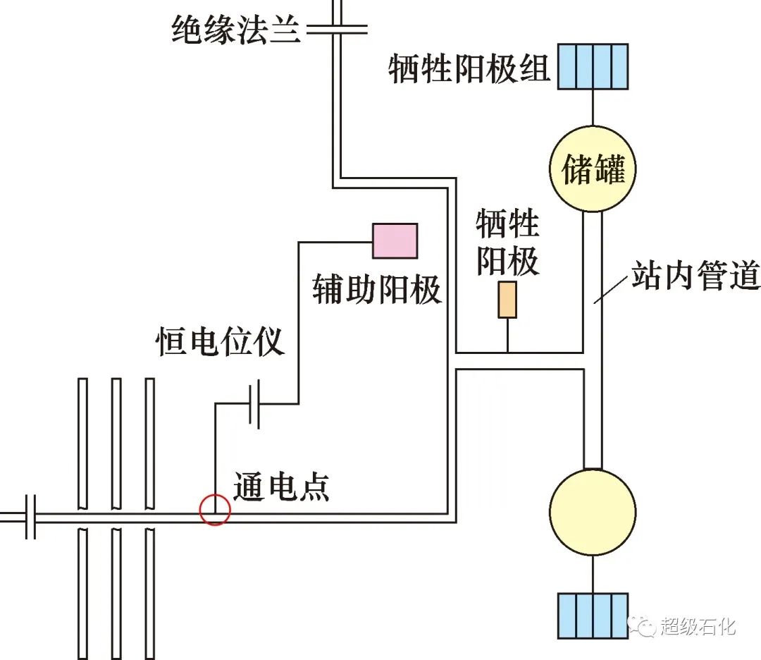 一般來(lái)說(shuō),由于站場(chǎng)內(nèi)儲(chǔ)罐多、管道縱橫交錯(cuò),并且區(qū)域相對(duì)封閉,因此在站場(chǎng)內(nèi)多采用犧牲陽(yáng)極+強(qiáng)制電流共同的陰極保護(hù)方式。