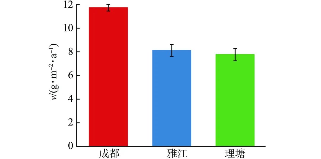 圖1 紫銅在成都、雅江、理塘大氣環(huán)境中暴露一年后的腐蝕速率