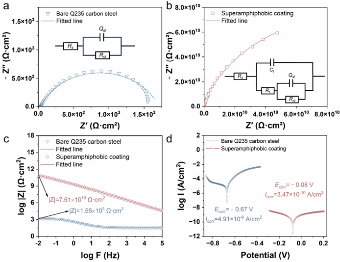 研究結(jié)果發(fā)現(xiàn)所制備的超雙疏自清潔涂層對不同表面張力的液體均展現(xiàn)出優(yōu)異的斥液性和液體無損傳輸功能。電化學(xué)測試結(jié)果顯示涂層表面電荷轉(zhuǎn)移電阻較空白碳鋼基體提升8個(gè)數(shù)量級(jí)、腐蝕電位正移590 mV、腐蝕電流下降4個(gè)數(shù)量級(jí)。