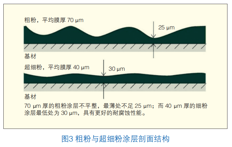 常規(guī)的粉末涂料的粉體粒徑都是30~50 μm。粉末越細(xì),涂層越平整,厚度越薄。但粉末太細(xì)就會(huì)造成粉體抱團(tuán),無(wú)法噴涂。我們經(jīng)過(guò)多年的努力,利用納米科技,徹底解決了超細(xì)粉末抱團(tuán)無(wú)法流化的難題,進(jìn)而發(fā)明了超細(xì)粉末涂料技術(shù),將粉體粒徑降低到10~20 μm。超細(xì)粉可以得到薄而平整的涂層表面,徹底解決了粉末涂裝平整度差和厚度太高的兩大難題。實(shí)驗(yàn)證明,同樣的粉末涂料,粗粉涂層70 μm的耐鹽霧測(cè)試性能,沒(méi)有40 μm的超細(xì)粉涂層好,原因是70 μm的粗粉涂料的最低處膜厚小于25 μm,而40 μm的超細(xì)粉涂層的最低處高于30 μm(圖3)。