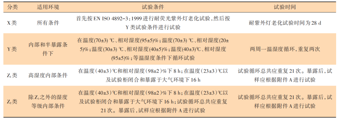 歐洲以ETAG:2006,part2作為指導(dǎo)性的防火涂料檢測(cè)導(dǎo)則,根據(jù)防火涂料敷設(shè)環(huán)境的嚴(yán)酷程度不同將防火涂料分為X、Y、Z1、Z2等4類,如表2所示。