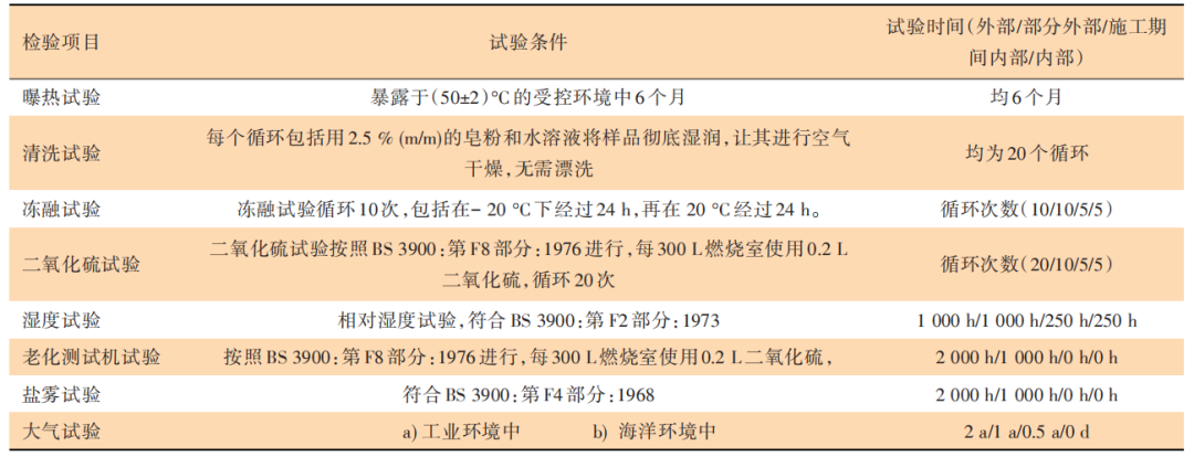 英國涂料標(biāo)準(zhǔn)也按照環(huán)境類型的不同對(duì)涂料進(jìn)行了分類,英國標(biāo)準(zhǔn)對(duì)每一類涂料都進(jìn)行比較全面的試驗(yàn)。該標(biāo)準(zhǔn)比較顯著的特征是各試驗(yàn)耗時(shí)較長(zhǎng),最長(zhǎng)的自然暴露試驗(yàn)時(shí)間長(zhǎng)達(dá)兩年,老化試驗(yàn)和鹽霧試驗(yàn)也需要2000 h。