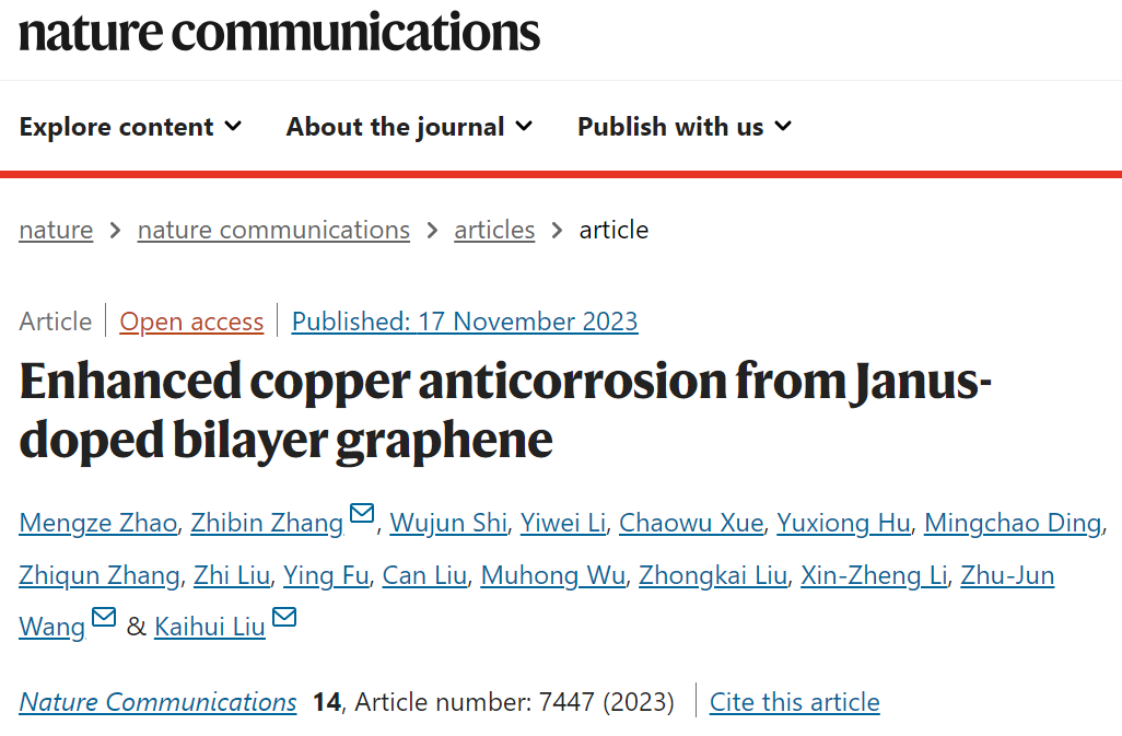 銅電極的原子厚防腐涂層對(duì)于半導(dǎo)體行業(yè)的小型化至關(guān)重要。石墨烯長(zhǎng)期以來(lái)被期望成為終極防腐材料,但其真正的防腐性能仍存在很大爭(zhēng)議。具體來(lái)說(shuō),強(qiáng)電子耦合可以限制腐蝕性分子的界面擴(kuò)散,同時(shí)也可以促進(jìn)表面電偶腐蝕。近日,北京大學(xué)教授、2021年“科學(xué)探索獎(jiǎng)”前沿交叉領(lǐng)域獲獎(jiǎng)人劉開(kāi)輝與上??萍即髮W(xué)王竹君教授等合作者揭示了銅上雙層石墨烯的雙面各異摻雜機(jī)制,成功實(shí)現(xiàn)了對(duì)銅箔的超高效防腐——可在200 ℃下保護(hù)銅箔1000小時(shí)以上,達(dá)到了工信部《重點(diǎn)新材料首批次應(yīng)用示范指導(dǎo)目錄》中要求的1000倍,有望拓展銅在高溫、高濕等極端環(huán)境下的應(yīng)用前景。相關(guān)研究成果已在線發(fā)表于Nature Communications上。