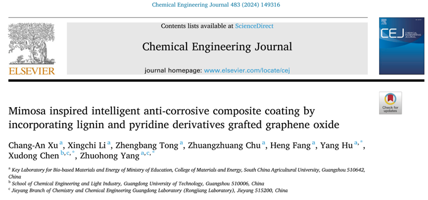 基于此,華南農(nóng)業(yè)大學材料與能源學院楊卓鴻教授團隊受含羞草應(yīng)激閉合機制啟發(fā),以苯乙烯為稀釋劑、環(huán)氧乙烯基酯樹脂為主體樹脂、木質(zhì)素和吡啶衍生物改性的氧化石墨烯為填料,采用熱聚合方式制備了對腐蝕產(chǎn)物亞鐵離子具有常溫響應(yīng)的智能防腐涂層。在此過程中稀釋劑苯乙烯參與自由基聚合反應(yīng),有效避免了溶劑的揮發(fā),而且制備過程綠色環(huán)保、無污染。相關(guān)研究成果已于近日發(fā)表在中科院一區(qū)Top期刊Chemical Engineering Journal上。