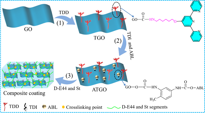 該工作首先采用制備的含N單體對氧化石墨烯(GO)進行功能性改性,把對亞鐵離子產(chǎn)生絡(luò)合作用的吡啶基團引入到GO上,隨后以異氰酸酯為“橋梁”,利用聚加成反應(yīng)將雙鍵木質(zhì)素接枝到GO(ATGO)上,以此來改善GO在樹脂中的分散性和相容性,最后將ATGO填料加入到環(huán)氧乙烯基酯樹脂中,在加熱條件下引發(fā)雙鍵發(fā)生自由基聚合反應(yīng)來制備復(fù)合涂層。