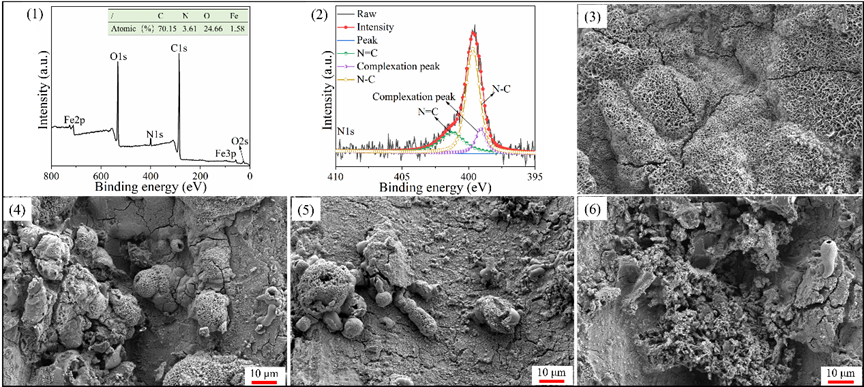 圖5. ATGO-CM涂層劃痕處腐蝕產(chǎn)物的XPS(1)和N1s的分峰擬合曲線(2);在3.5wt%鹽水中浸泡3天后,CM(3)、GO-CM(4)、TGO-CM(5)和ATGO-CM涂層在劃痕處的形貌