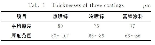 表1給出了三種涂層厚度測試結(jié)果。從表1可以看出:三種涂層的平均厚度均為75~80μm,沒有明顯區(qū)別。而熱噴鋅涂層厚度離散性很大, 最小為50μm, 最大為107μm;富鋅涂料涂層和冷噴鋅涂層最小厚度約為65μm, 明顯高于熱噴鋅涂層的最小厚度 (50μm) 。涂層的耐蝕性不僅僅取決于其平均厚度, 更取決于涂層的最小厚度和涂層致密性。涂層失效一般開始于缺陷處或耐蝕性最差處。涂層的最小厚度越小, 發(fā)生失效時間越短。涂層致密性越差, 腐蝕介質(zhì)越容易滲透涂層到達(dá)基體, 腐蝕也就越快。在平均厚度相當(dāng)時, 熱噴鋅涂層的最小厚度較小, 粗糙度較大, 故其耐蝕性較差。