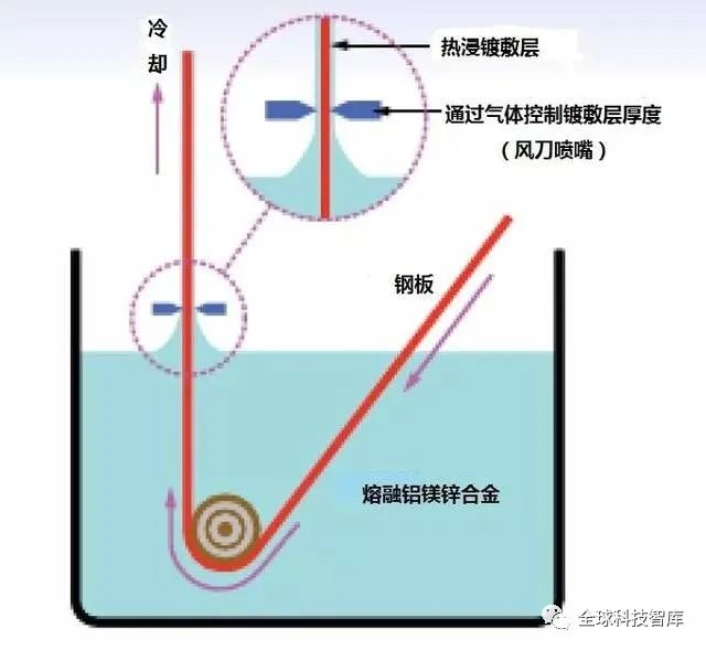 鍍鋁鎂鋅技術(shù)屬于金屬表面預(yù)先防腐處理技術(shù),即金屬板材在出場前,已完成表面防腐處理,金屬板材在進一步加工時無需再次進行防腐處理。VCI片鋅技術(shù)屬于金屬加工后表面防腐處理技術(shù),即需要在金屬構(gòu)件加工完成后,再對表面進行防腐處理。二者鍍敷工藝不同,鍍鋁鎂鋅屬于熱浸鍍敷(如圖2-1所示);VCI片鋅技術(shù)屬于涂覆工藝,以鱗片型富鋅涂料為底漆,鱗片性鋁涂料(可調(diào)色)為面漆,亦或底、面漆合一。