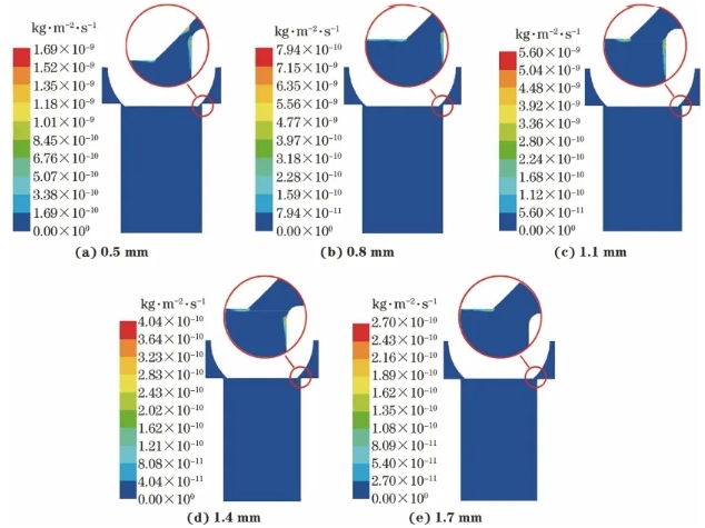 在相同工況下,密封間隙的大小直接影響上返液體的速率。根據(jù)對井下放氣閥密封頭腐蝕間隙的實際測量,將密封間隙的范圍設(shè)定為0.5~1.7 mm,上返排量為6 L/s,含砂量為0.05%。按照0.3 mm間隔,改變密封頭與下接頭之間的密封間隙,使其分別為0.5、0.8、1.1、1.4、1.7 mm,模擬結(jié)果如圖4所示。