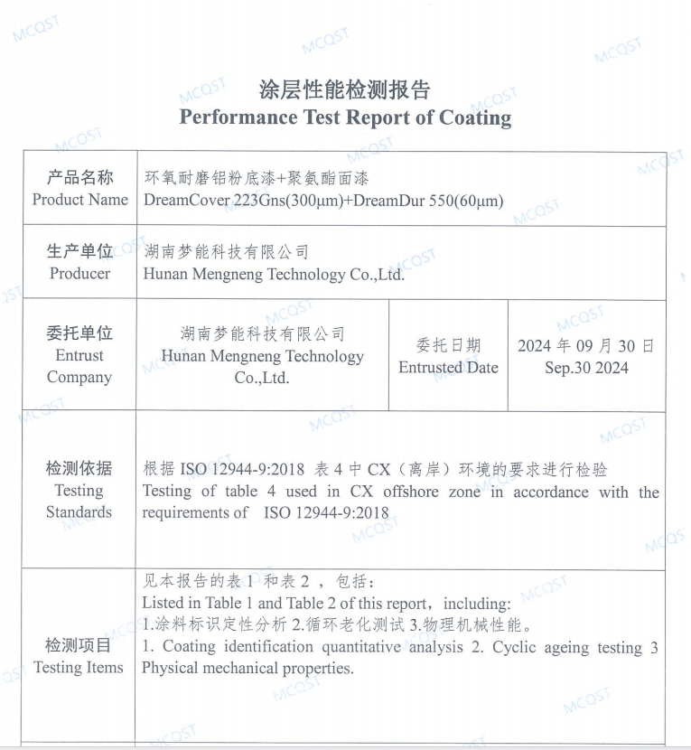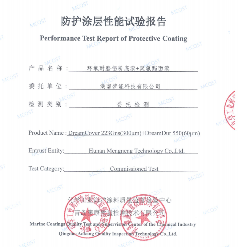 在工業(yè)防護(hù)領(lǐng)域,涂料的性能直接關(guān)乎被防護(hù)設(shè)備的使用壽命與安全,湖南夢能科技有限公司委托檢測的環(huán)氧耐磨鋁粉底漆 + 聚氨酯面漆(DreamCover 223Gns (300μm)+DreamDur 550 (60μm) ),經(jīng)化學(xué)工業(yè)海洋涂料質(zhì)量監(jiān)督檢驗(yàn)中心檢測,各項(xiàng)性能指標(biāo)清晰呈現(xiàn),為該涂料在工業(yè)場景的應(yīng)用提供了專業(yè)依據(jù)。